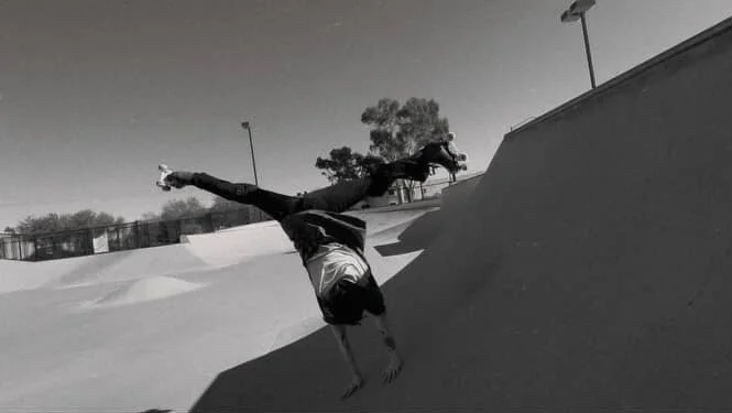 Having a background in gymnastics, dance, figure skating, and some rollerblading has definitely helped me with tricks! My figure skating experience shines through when I do spins, gymnastics helps with my cartwheels, and dance influences the way I piece together a line or just have fun at the rink or on flat ground. Skating on rollerblades as a kid made the transition to quad/roller skating feel more familiar, even though they are quite different!